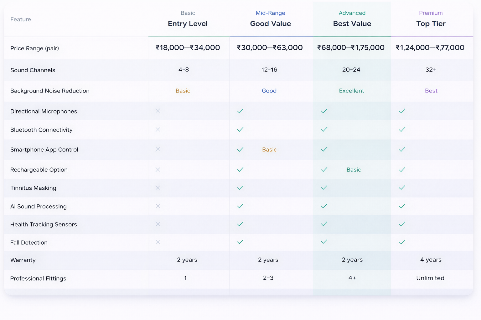 Discover transparent pricing for all hearing aid types. From budget-friendly options starting at ₹18K to premium devices with AI technology. No hidden fees, just clear answers.